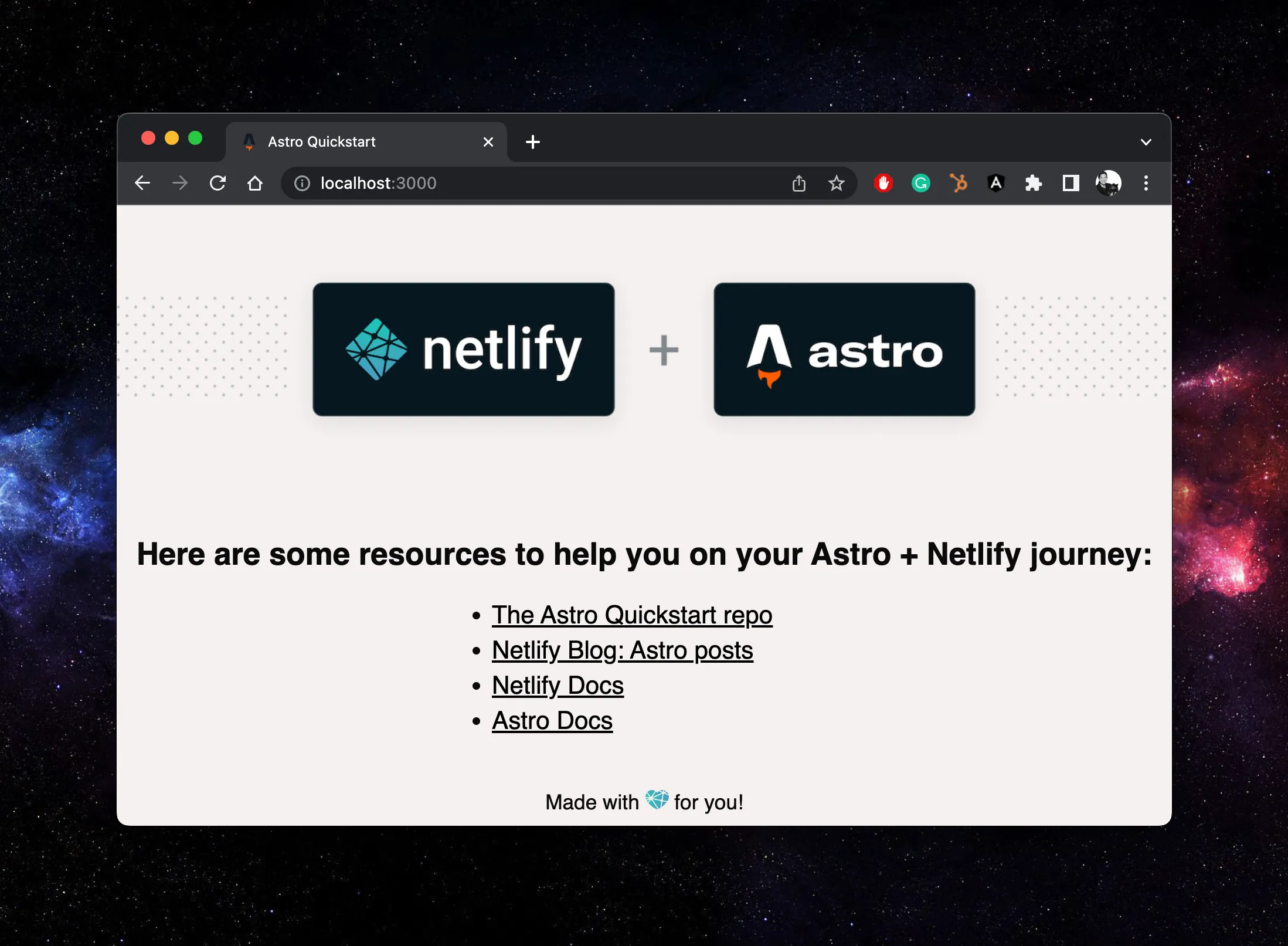 If you’d like to skip the steps above and try out Astro on Netlify in just two minutes ✨, we built an Astro quick start template you can deploy to Netlify. Check out this blog post to learn more, or click the Deploy to Netlify button below to try it out.